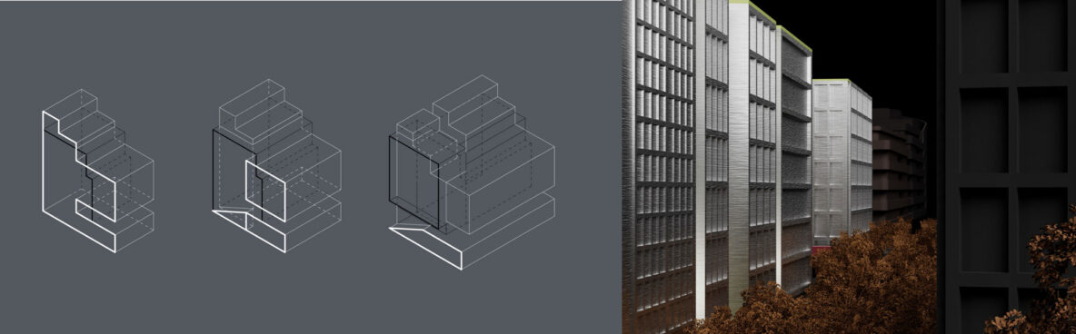 Cornucopia is a dynamic whole constituted by a diversity of individual buildings. On the outside perimeter it follows the logic of the existing urban fabric, allowing for classical accentuated corners; lively ground floor with small shops and businesses; a plethora of unique details for each facade; and a rich colour scheme. Inside the block the courtyard space is maximised to expose all flats to daylight and offer interesting perspectives into cozy yet characteristic environment. The structure provides for a broad array of housing typologies and increases the number of distinctive corner apartments with terraces.